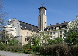 | Südostansicht der ehemaligen Kloster- und Pfarrkirche Maria vom Berge Karmel (Karmeliterkirche) und des ehemaligen Klostergebäudes am Stefan-Fadinger-Platz 1 im 10. Wiener Gemeindebezirk Favoriten . Die Kirche wurde ab 1928 anstelle einer abgebrannten Notkirche nach Plänen von Hans Prutscher errichtet und erst 1942 vollendet. Sie war nach Plecniks wegweisender Pfarrkirche auf der Schmelz (1911) die zweite „Betonkirche“ in Wien. Am 21. Februar 1945 wurde sie durch Fliegerbomben weitgehend zerstört (mit 140 Todesopfern). Nach Kriegsende erfolgte der Wiederaufbau, so dass nach der Wiederherstellung von Kuppel und Dach (1950) die Unterkirche 1951 geweiht werden konnte. Die ab 1957 begonnene Wiederherstellung der Oberkirche und der Bau des Turmes erfolgte stark verändert nach Plänen von Helene Koller-Buchwieser und mit der Glockenweihe am 15.Mai 1966 wurde der Wiederaufbau abgeschlossen. Mit Jahresende 2014 erfolgte die Übergabe des Gotteshauses mit Klostergebäude und Garten mangels Gläubiger, Priestermangel und Kostenreduktion, etc. an die aufstrebende syrisch-orthodoxe Metropolie . | Eigenes Werk | C.Stadler/Bwag | Datei:Favoriten (Wien) - Syrisch-Orthodoxe Kirche mit ehemaligem Klostergebäude.JPG | |