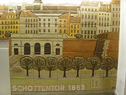 | View of the Situation 1863 of the old Schottentor - Wallmosaik at the entrance of Realgymnasium Schottenbastei (Vienna, Austria) :today all buildings are demolished, except the white house (with the 12 Windows in the Background) - this is still today the Schottenhof. As well the three buildings at the right side - they are situated today still on the Mölkerbastei | Eigenes Werk | Christiansitte | Datei:Schottenbastei schottentoransicht Eingangsmosaik Realgymnasium.jpg | |