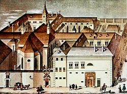 | Das ehemalige Nonnenkloster zu St.Maria, Königin der Engel . Nach der in Herzogs Cosmographia Franzciscana enthaltenen Vogelperspective vom Jahr 1740 | http://www.stadtkirche.at/Jubiläumsbroschüre/Jubiläumsbroschüre%20(2008-11-20)%20-%201%20Vorgeschichte.pdf | J.W. Zim???. | Datei:Königinkloster.JPG | |