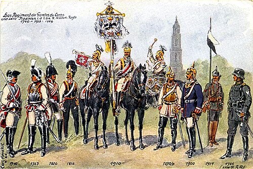 - Die Offizierkorps der Kavallerieregimenter hatten allgemein einen höheren Anteil adliger Offiziere als die anderer Truppengattungen. Im GdC gab es noch 1913 außer den fünf Ärzten und Tierärzten keinen einzigen bürgerlichen Offizier. Von den 34 Offizierstellen wurden 20 durch Fürsten und Grafen besetzt. Der Anteil des Hoch- und Uradels nahm damit im GdC einen Spitzenplatz im Vergleich aller Regimenter ein. Philipp zu Eulenburg, der im GdC gedient hatte, nannte sein Regiment „die eleganteste der eleganten Garden“.[4]