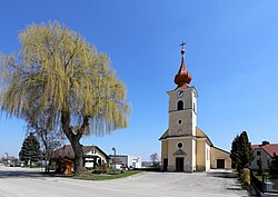 | Katholische Filialkirche hl. Katharina in Reichersdorf, ein Ortsteil der niederösterreichischen Marktgemeinde Nußdorf ob der Traisen . Ein schlichter Bau aus dem Jahr 1830 mit einer rundbogig geschlossener Apsis und genutetem Westturm. Südseitig wurde 1972 eine Aufbahrungshalle angebaut. | Eigenes Werk | C.Stadler/Bwag | Datei:Reichersdorf - Kirche.JPG |