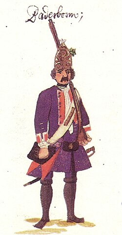 | Paderborner Soldat aus der Gudenushandschrift 1734, Generallandesarchiv Karlsruhe | Reiter, Husaren und Grenadiere: Die Uniformen der Kaiserlichen Armee am Rhein 1734; Zeichnungen des Philipp Franz Freiherrn von Gudenus; Bearbeitet und Texte von Hans Bleckwenn; Dortmund 1979 | Philipp Franz Freiherrn von Gudenus | Datei:Paderbornischer Soldat Gudenushandschrift 1734 Karlsruhe.jpg | |