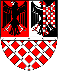 - „Halbgespalten und geteilt; oben vorn in Rot ein schwarzer, silbern bewehrter Adler, oben hinten von Silber und Schwarz gespalten und belegt mit einem rot, bzw. silbern bewehrten Adler, dessen rechte Hälfte schwarz mit silberner Mondsichelspange und dessen linke Hälfte von Silber und Rot geschacht; unten in Rot ein silbernes Schräggitter.“