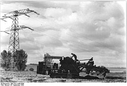 | Es folgt die historische Originalbeschreibung , die das Bundesarchiv aus dokumentarischen Gründen übernommen hat. Diese kann allerdings fehlerhaft, tendenziös, überholt oder politisch extrem sein. Eilsleben, Meliorationsmaschine, Grabenbau Zentralbild Biscan 25.9.1953 1000 ha Kulturland werden gewonnen. Dank der großzügigen Hilfe unserer Regierung, die bisher 800.000 DM zur Verfügung gestellt hat, kann der sogenannte Seelsche Bruch in der Nähe von Eilsleben trockengelegt werden. Zu diesem Zweck werden 70 cm tiefe Gräben durch den ganzen Bruch gezogen und Drainröhren in einer Gesamtlänge von 610 km gelegt. Durch dieses Binnenentwässerung werden 1000 ha Moorwiesen, die mehr als 400 Bauern und Volksgütern der Umgebung gehören, in fruchtbaren Ackerboden verwandelt. UBz: Der der privaten Tiefbaufirma Wilhelm Arndt in Haldersleben gehörende Spezialbagger für Vorflutgräben - die einzige derartige Maschine in der DDR. | Dieses Bild wurde im Rahmen einer Kooperation zwischen dem deutschen Bundesarchiv und Wikimedia Deutschland aus dem deutschen Bundesarchiv für Wikimedia Commons zur Verfügung gestellt. Das deutsche Bundesarchiv gewährleistet eine authentische Bildüberlieferung nur durch die Originale (Negative und/oder Positive), bzw. die Digitalisate der Originale im Rahmen des Digitalen Bildarchivs . | Wilhelm Biscan | Datei:Bundesarchiv Bild 183-21445-0006, Eilsleben, Meliorationsmaschine, Grabenbau.jpg | |