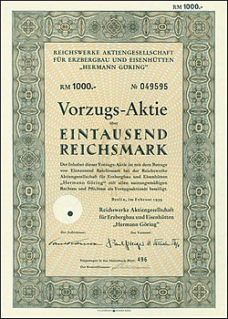 | Vorzugsaktie über 1000 RM der Reichswerke AG für Erzbergbau und Eisenhütten "Hermann Göring" vom Februar 1939 | Sammlung eines Mitglieds des Ersten Deutschen Historic-Actien-Clubs e.V (EDHAC e.V.); (le) | Unbekannte Autoren und Grafiker; Scan vom EDHAC e.V. | Datei:Reichswerke AG für Erzbergbau und Eisenhütten 1939.jpg |