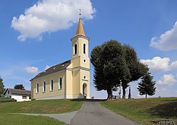 Katholische Filialkirche Christi Himmelfahrt: 1902 erbautes Kirchengebäude auf einem Hügel im Zentrum des Dorfes. Die Kirche steht unter Denkmalschutz (Listeneintrag).