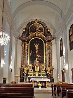 Der wandfüllende, flache Hochaltar von 1784 trägt ein 1778 von einem Knoller gemaltes Kreuzigungsbild und ein von Josef Veiter restauriertes Oberbild mit dem Martyrium des heiligen Laurentius. Der als Kuppelbau mit Säulen ausgeführte spätbarocke Tabernakel zeigt an der Tür ein Relief mit der Kreuzabnahme. Seitlich sind zwei um 1700 entstandene Reliquienbehälter mit Miniaturbildern der Apostelfürsten Petrus und Paulus in reichen Aktanthusrahmen aufgestellt. Die beiden großen, knienden Engel schuf 1786 Michael Zill.