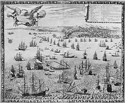 - ↑ Vor allem in der älteren Literatur wird häufig der 11. Dezember als Tag der offiziellen spanischen Kriegserklärung genannt. z. B. Heinrich Leo: Zwölf Bücher niederländischer Geschichten. Teil 2: Enthaltend die letzten sechs Bücher oder Die Geschichte der Niederlande vom Beginn der Herrschaft des Hauses Burgund bis 1830. Eduard Anton, Halle 1835, S. 865.