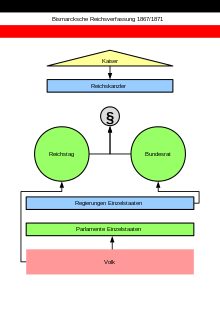 | Schaubild: Verfassung des Deutschen Reiches vom 16. April 1871, mit Stellvertretungsgesetz 1878. Deutsch. | Eigenes Werk | Ziko van Dijk van Dijk | Datei:Verfassungsdiagramm Deutsches Reich 1871 DE.svg | |