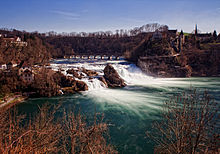 Unterhalb von Schaffhausen liegt der Rheinfall, er ist bei einer mittleren Wasserführung von 370 m³/s[15] (mittlerer Sommerabfluss circa 700 m³/s) hinter dem Dettifoss in Island der zweitgrößte Wasserfall Europas nach dem Kriterium der Fallenergie. Das Bild des Hochrheins wird durch zahlreiche Staustufen geprägt. Auf den wenigen verbliebenen natürlichen Abschnitten gibt es jedoch noch mehrere Stromschnellen, hier Laufen genannt. Beim aargauischen Koblenz mündet von Süden die Aare, die zwar kürzer als der Rhein bis hierher ist, aber mit einem durchschnittlichen Abfluss von 560 m³/s[16] deutlich mehr Wasser als der Rhein oberhalb dieser Stelle mit 440 m³/s[17] führt und damit der hydrologische Hauptstrang des gesamten Flusssystems ist. Bei Rheinfelden erreicht der Rhein im St.-Anna-Loch eine Tiefe von 32 m.