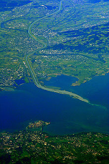 | Luftbild der Mündung des Rheins in den Bodensee, im Vordergrund Hard (Österreich), und die Mündung der Bregenzer Ach (unten rechts). | Eigenes Werk | Carsten Steger | Datei:Aerial image of the mouth of the Rhine into Lake Constance.jpg | |