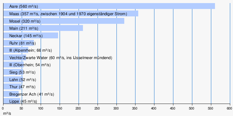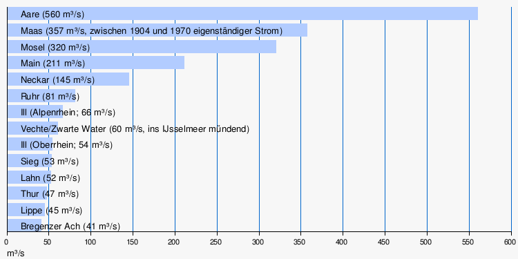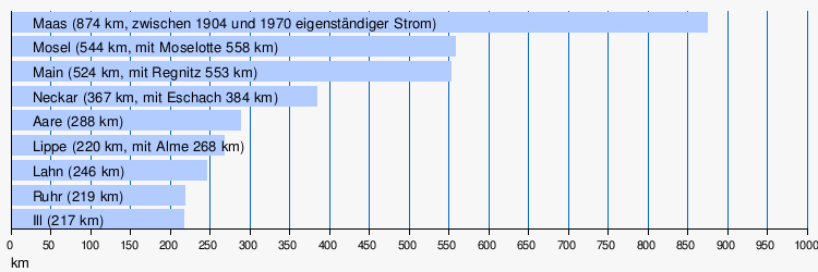 Die größten Nebenflüsse des Rheins, gemessen an Länge, Einzugsgebiet und Mittlerem Abfluss (MQ), sind, von der Quelle bis zur Mündung geordnet: Aare, Neckar, Main, Mosel und Maas. Mit ihnen hat sein Einzugsgebiet Anteil an neun Staaten. Der flächenmäßig größte Teil davon liegt in Deutschland, gefolgt von Frankreich, den Niederlanden und der Schweiz. Der Rhein ist der zehntlängste Fluss Europas und der siebtlängste, der direkt ins Meer mündet.[7] Unter den Flüssen des deutschen Sprachraums ist er der zweitlängste nach der Donau und vor der Elbe.[8]