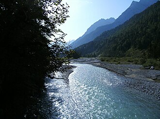 - Torbach, von links bei Hinterriß am Rechtsknick des Flusses