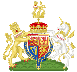 | Coat of Arms of HRH Prince Richard, Duke of Gloucester . (born 1944) second son of Prince Henry, Duke of Gloucester (third son of King George V) and Alice Montagu Douglas Scott. The coat of arms was granted in 1962. “ Quarterly, 1st and 4th Gules three lions passant guardant in pale Or armed and langued Azure (for England), 2nd quarter Or a lion rampant within a double tressure flory-counter-flory Gules (for Scotland), 3rd quarter Azure a harp Or stringed Argent (for Ireland), with over all a label of five points Argent, the centre and two outer points charged with a cross Gules, and the inner points with a lion passant guardant also of Gules, the escutcheon ensigned by a coronet of a grandchild of the Sovereign, the whole surrounded by the Garter, for a crest on a coronet of his rank, thereon a lion statant guardant Or crowned of the same coronet charged with a label as in the arms, for supporters, dexter a lion rampant guardant Or crowned by the same coronet, sinister a unicorn Argent armed, crined and unguled Proper, gorged with the same coronet, attached thereto a chain affixed thereto passing between the forelegs and reflexed over the back also Or, both charged on the shoulder with a label as in the arms. ” | Eigenes Werk | Sodacan | Datei:Coat of Arms of Richard, Duke of Gloucester.svg | |