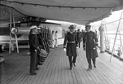| Es folgt die historische Originalbeschreibung , die das Bundesarchiv aus dokumentarischen Gründen übernommen hat. Diese kann allerdings fehlerhaft, tendenziös, überholt oder politisch extrem sein. Amerikanische Schlachtschiffe besuchen das erste Mal nach dem Kriege Deutschland! In Kiel traf das erste Mal nach dem Kriege ein aus den amerikanischen Schlachtschiffen "Arkansas", "Florida" und "Utah" bestehendes Geschwader unter Führung von Admiral Cluverzius ein. Von den deutschen Linienschiffen "Hessen" und "Schleswig Holstein" wurden zu ihrer Begrüßung 21 Schuss Salut gefeuert. - Der Commandeur der amerikanischen Schlachtschiffe Admiral Cluverius (links) an Bord des deutschen Linienschiffes "Schleswig Holstein" schreitet mit dem stellvertretenden Flottenchef der Ostsee-Station Admiral Förster (rechts) die Ehrenwache ab. | Dieses Bild wurde im Rahmen einer Kooperation zwischen dem deutschen Bundesarchiv und Wikimedia Deutschland aus dem deutschen Bundesarchiv für Wikimedia Commons zur Verfügung gestellt. Das deutsche Bundesarchiv gewährleistet eine authentische Bildüberlieferung nur durch die Originale (Negative und/oder Positive), bzw. die Digitalisate der Originale im Rahmen des Digitalen Bildarchivs . | Unbekannt Unknown | Datei:Bundesarchiv Bild 102-10063, Admiral Cluverius an Bord der "Schleswig Holstein".jpg | |