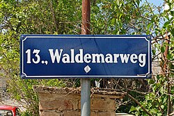 | Straßenschild Waldemarweg in Wien-Auhof. | Eigenes Werk | Funke | Datei:20210627 Waldemarweg Straßenschild.jpg | |