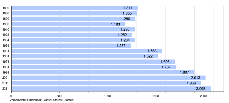 1991 hatte die Gemeinde laut Volkszählung 1.897 Einwohner, 2001 dann 2.013 Einwohner. Die Zunahme erfolgte wegen der positiven Geburtenbilanz (+119), die Wanderungsbilanz war nahezu ausgeglichen. Von 2001 bis 2011 nahm die Abwanderung zu und die Geburtenbilanz wurde kleiner (+63), sodass es zu einem Rückgang der Bevölkerungszahl auf 1.969 Personen im Jahr 2011 kam.[2]