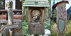 | Darstellungen des Riesen Erla , der Hexe Kranawitha und der Nixe Blondchen (Waldlehrpfad am Grünberg, Gmunden) | Eigenes Werk | Gerhard Anzinger, Wels | Datei:Erla - Kranawitha - Blondchen.jpg | |