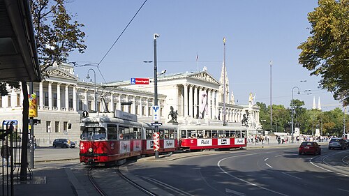 Zug der Linie 1 vor dem Parlament am äußeren Ring, kurz vor Erreichen der Haltestelle Dr.-Karl-Renner-Ring |