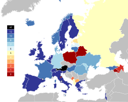 | 13× | 1 | 12 | Griechenland (1/2), Niederlande (1/1), Vereinigtes Königreich (3/3), Schweden (1/1), Israel (1/2), Portugal (6/1), Irland (1/3), Finnland (1/1), Spanien (2/2), Belgien (3/3), Italien (3/2), Schweiz (1/1), Slowenien (1/1) |