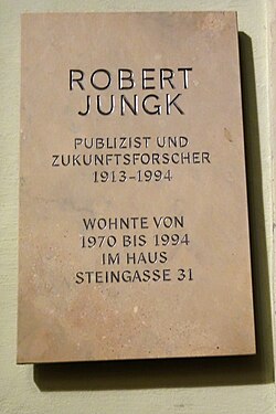 Schild vor der ehemaligen Wohnung von Robert Jungk | Eigenes Werk Originaltext : selbst fotografiert | User:Mnntoino | Datei:Junk Steingasse 2018.jpg | |