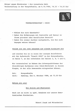 Flugblatt von Robert Jungk 1984 | Fundstück | Robert Jungk | Datei:RobertJungk Flugblatt 1984.jpg | |