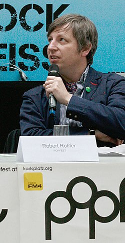 | Robert Rotifer bei der Pressekonferenz zur Programmpräsentation des Popfest Wien 2011 im Wien Museum . | Eigenes Werk | Manfred Werner - Tsui | Datei:Popfest Wien 2011-04-14 Programmvorstellung01 Robert Rotifer c.jpg | |