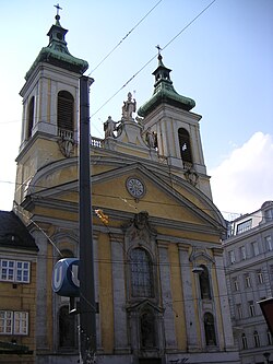 Die Kirche wurde ab 1642 an der Stelle einer früheren Rupertikapelle als Klosterkirche der Unbeschuhten Augustiner-Eremiten erbaut und während der Zweiten Wiener Türkenbelagerung 1683 vollständig zerstört. 1687 begann man mit dem Bau der neuen Kirche im barocken Stil. Die Fassade wurde 1718–1721 gestaltet, seither hat sich das äußere Erscheinungsbild der Kirche nicht mehr wesentlich verändert. 1783 wurde sie Landstraßer Pfarrkirche. Im Jahr darauf wurde die bisherige Pfarrkirche, die Nikolaikirche, die sich unmittelbar davor an der Stelle des heutigen Rochusmarkts befand, abgerissen.[2] Das Kloster wurde 1812 aufgehoben.[3] Zwei Flügel des ehemaligen Kreuzgangs südöstlich der Kirche sind noch erhalten. Ab dem Jahr 2000 wurde die Kirche umfassend renoviert. Im Zuge der Renovierung wurde der gelbe Anstrich („Schönbrunner Gelb“) durch Grau und Weiß ersetzt (Befund).