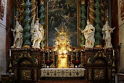 Der dreigeschoßige Hochaltar wurde 1689 von Kaiser Leopold I. gestiftet. Im Sockelgeschoß führen zwei Türen links und rechts von der Altarmensa in die dahinterliegende Sommersakristei. Der gesprengte Giebel mit reich verkröpftem Gebälk wird von mächtigen, gestaffelten Pilastern und Spiralsäulen getragen. Der Giebel wird in der Mitte vom kaiserlichen gekrönten Doppeladler bekrönt. Die Säulen sind mit Bandornamenten, Akanthusschnitzwerk, Blumengirlanden und Voluten verziert. Die Wände im Altarraum sind durch einfache rote Stuckmarmorpilaster gegliedert und in blasser Elfenbeinmarmorierung gehalten.