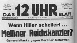 | German newspaper scoop from the "12 Uhr Blatt" presenting speculations about Secretary of State Otto Meissner becoming Reichschancellor. The Caption reads "Wenn Hitler scheitert ... Meißner Reichskanzler?" ("If Hitler who was at that time commonly expected to be the most likley next Chancellor should fail in performing the tasks of the Chancellor satisfactorily ...will Meissner be appointed Chancellor?" | Editorial to the Newspaper "Das 12 Uhr Blatt" (issue published on 22nd of November, 1932) | Editorial staff to the "12 Uhr Blatt" | Datei:Meissner Chancellor19320001.jpg | |