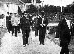 | Weikersdorf (seit 1921 Teil von Baden bei Wien), Hohenzollernplatz (heute: Weikersdorfer Park/Platz), Erzherzog Rainer (1827–1913) bei der Eröffnung der Ausstellung „Ausstellung für Gewerbe, Handel, Industrie, Volksernährung und Weinbau des Viertels unterm Wienerwald“; im Hintergrund: Amtshaus Weikersdorf (heute: Rollettmuseum) | Wiener Bilder, 2. Februar 1913 | Autor/-in unbekannt Unknown author | Datei:Baden-bei-Wien-Weikersdorf-Weikersdorfer-Park-17.-August-1912.jpg | |