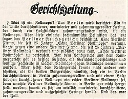 | Zeitungsmeldung über einen Gerichtsverhandlung in Berlin zum Thema Rollmops, Innsbrucker Nachrichten vom 28. August 1931, Nr 196, S. 8 | Zeitungsmeldung; Innsbrucker Nachrichten vom 28. August 1931, Nr. 196, Seite 8 | Autor unbekannt | Datei:Zeitungsmeldung Rollmops 1931.jpg |