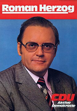 Roman Herzog (* 5. April 1934 in Landshut; † 10. Januar 2017 in Bad Mergentheim[1]) war ein deutscher Jurist und Politiker (CDU). Roman Herzog war von 1994 bis 1999 der siebte Bundespräsident der Bundesrepublik Deutschland. Zuvor war er von 1978 bis 1980 Kultus-, von 1980 bis 1983 Innenminister des Landes Baden-Württemberg und von 1983 bis 1994 Richter des Bundesverfassungsgerichts, ab 1987 als dessen Präsident.