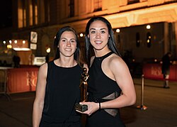 | Manuela Zinsberger (r.) und Viktoria Schnaderbeck ( Österreichische Fußballnationalmannschaft der Frauen ) am red carpet der Romyverleihung 2018 in der Hofburg in Wien , Österreich . | Eigenes Werk | Manfred Werner (Tsui) | Datei:Manuela Zinsberger Viktoria Schnaderbeck ROMY 2018.jpg | |