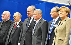 | German leaders at rally against anti-Semitism in Berlin, 14 September 2014. Left to right: Cardinal Reinhard Marx, Protestant Church leader Nikolaus Schneider, World Jewish Congress President Ronald S. Lauder, German Federal President Joachim Gauck, Central Council of Jews in Germany President Dieter Graumann, German Federal Chancellor Angela Merkel | Eigenes Werk | Michael Thaidigsmann | Datei:Marx-Schneider-Lauder-Gauck-Graumann-Merkel.jpg | |