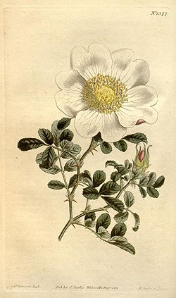 Bereits Theophrastos von Eresos unterschied zwischen rhódon, den Rosen mit gefüllten Blüten, und kynosbatos, wilden Rosen. Aus dem antiken Rom und Ägypten gibt es eine große Zahl von Berichten über Rosen, meist über die Nutzung und ihre Kultur in Gärten. Die Abbildungen in den frühneuzeitlichen Kräuterbüchern sind meist nicht bestimmten Arten zuordenbar. Verbreitete und in Europa bekannte Rosenarten[15] waren die Feldrose (Rosa arvensis), die Hundsrose (Rosa canina), die Zentifolie (Rosa centifolia) und die Essigrose (Rosa gallica).
