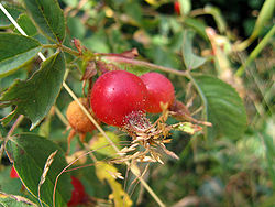In der Heilkunde werden ganze Hagebutten (Cynosbati fructus cum semine), Hagebuttenschalen (Rosae pseudofructus) und die Hagebuttenkerne (Cynosbati semen) genutzt. Verwendet werden verschiedene Arten, vorwiegend Rosa canina und Rosa pendulina. Die Hagebutten enthalten getrocknet zwischen 0,2 und 2 % Ascorbinsäure, reichlich Pektine (rund 15 %), Zucker, Fruchtsäuren, Gerbstoffe und geringe Mengen ätherisches Öl. Verwendet werden Hagebutten gegen Erkältungskrankheiten, Darmerkrankungen, Gallenleiden, als Diuretikum, bei Gicht und Rheuma. Die Wirksamkeit ist in allen Fällen nicht bzw. nicht ausreichend belegt. Für die diuretische Wirkung könnten der Pektin- und Fruchtsäuregehalt verantwortlich sein. Verwendet werden die Hagebutten besonders als Tee oder in Teemischungen. Frische Hagebutten werden zu Marmeladen verarbeitet.[35] Zum Kochen mit Heilwirkungen hat man bspw. in einem Kochbuch von 1547 gesprochen: „Rosenhonig sterket und reinigt den magen/von böser feuchtigkeit/reiniget und heilet gschwer/Feul und Schaden des Munds/Zahnfleisch/Hals und Gurgeln“.[36]