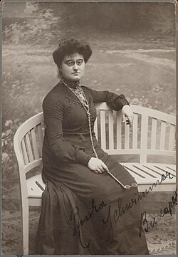 | Rosika Schwimmer (1877-1948). She was the world's first female ambassador (representing Hungary in Switzerland, 1918). Member of the board of the International Woman Suffrage Alliance van 1913-1920. From Dutch IAV-archives, returned from Moskou in 2003. Photo 1890's. | Atria Institut für Frauengeschichte | Lackner, Vienna. | Datei:Rosika Schwimmer, seated on bench.jpg | |