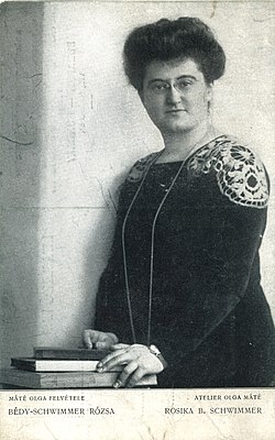 | TWL.2000.161Postcard, printed, cardboard, monochrome photographic studio portrait of 'ROSIKA B SCHWIMMER', standing next to a table with three books on it, upper body, front-profile, white border along bottom front edge, black text, printed inscription front: 'MATE OLGA FELVETELE ATELIER OLGA MATE BEDY-SCHWIMMER ROZSA ROSIKA B SCHWIMMER', printed inscription reverse (in four languages): 'INTERNATIONAL WOMAN SUFFRAGE CONGRESS BUDAPEST - HUNGARY', manuscript inscription reverse: 'Rosika Schwimmer Ambassador to USA United States of America Switzerland? during?'. | LSE Library | Olga Máté (1878-1961) | Datei:Schwimmer, Rosika Bc.1910 (22475434393).jpg |