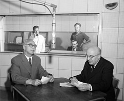 | Der Wiener Bürgermeister Franz Jonas bei einer Ansprache im Studio des Senders Rot-Weiß-Rot . Mit am Tisch sitzt der Kommentator Vincenz Ludwig Ostry . Im Hintergrund ist der Regie- und Kontrollraum mit Technikern zu sehen. | ÖNB, Bildarchiv der US-Informationsdienste in Österreich Inventarnummer: US 23.601 | Fotograf im Auftrag der United States Information Agency (Pictorial Section der Information Services Branch (ISB)) | Datei:USIS - Franz Jonas und Vincenz Ludwig Ostry.jpg | |