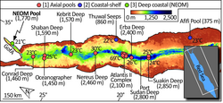 | Location and temperatures of the Red Sea brine pools. The Red Sea pools split into two convenient categories. 1 Pools in the deep (>1000 m) axial trough associated with the rift spreading axis ( red dots ). 2 Pools situated on the shallow coastal shelf (0–850 m depth) of the rift ( blue dots ). The NEOM Brine Pools, the first discovery in the Gulf of Aqaba (GofA), is neither located on the spreading axis, in the rift basin, nor on the continental shelf ( green dot ). | Discovery of the deep-sea NEOM Brine Pools in the Gulf of Aqaba, Red Sea . In: Nature : Communications Earth & Environment volume 3, Article number: 146 (2022); doi:10.1038/s43247-022-00482-x | Sam J. Purkis, Hannah Shernisky, Peter K. Swart, Arash Sharifi, Amanda Oehlert, Fabio Marchese, Francesca Benzoni, Giovanni Chimienti, Gaëlle Duchâtellier, James Klaus, Gregor P. Eberli, Larry Peterson, Andrew Craig, Mattie Rodrigue, Jürgen Titschack, Graham Kolodziej, Ameer Abdulla | Datei:43247 2022 482 Fig1 HTML.webp | |