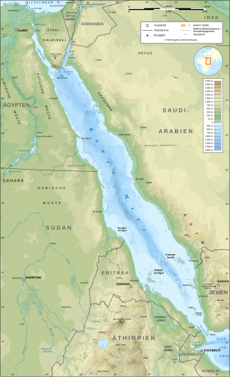 | Topografische/bathymetrische Karte des Roten Meeres , UTM-Projektion (WGS84-Datum), deutsche Version | Own work; Topographic data: NASA Shuttle Radar Topography Mission (SRTM30 v.2) (public domain) edited with 3DEM and dlgv32 Pro ; UTM projection; WGS84 datum; shaded relief (composite image of N-W, W and N lightning positions); Bathymetric data: NGDC ETOPO1; Shorelines and additional data: USGov public domain data VMap-0 ; Locator map: Image:World_map_with_nations.svg (modified) created by User:STyx under PD. | Eric Gaba ( Sting - fr:Sting ), translated by Titus Groan | Datei:Red Sea topographic map-de.svg | |