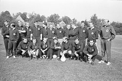 | Trainingslager in der Sportschule Malente. Hintere Reihe von links: Wolfgang Weber, Trainer Dettmar Cramer, Karl-Heinz Schnellinger, Klaus-Dieter Sieloff, Max Lorenz, Horst Szymaniak, Werner Krämer, Peter Grosser, Uwe Seeler, Assistenz-Trainer Udo Lattek, Franz Beckenbauer, Masseur Erich Deuser, Nationaltrainer Helmut Schön. Vordere Reihe von links: Horst-Dieter Höttges, Alfred Heiß, Willi Schulz, Lothar Ulsaß, Manfred Manglitz, Rudolf Brunnenmeier, Hans Tilkowski. | Stadtarchiv Kiel | Magnussen, Friedrich (1914-1987) | Datei:Fußballmannschaft der Deutschen Fußballnationalmannschaft (Kiel 77.611).jpg | |