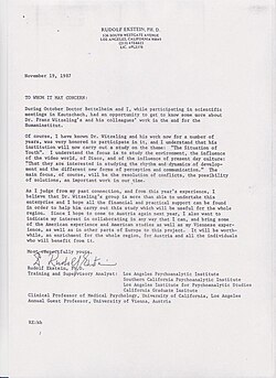 | Dokument der Forschungskorrespondenz mit Rudolf Ekstein und Bruno Bettelheim | Eigenes Werk | Schmeckts | Datei:Document of the research correspondence with Rudolf Ekstein and Bruno Bettelheim.jpg | |