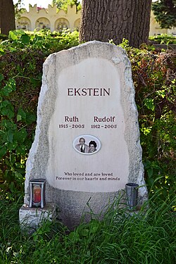 | Ehrenhalber gewidmetes Grab von Rudolf Ekstein auf dem Urnenhain der Feuerhalle Simmering , Gruppe 1, Abt. 7, Ring 3, Nr. 15 | Eigenes Werk | Haeferl | Datei:Feuerhalle Simmering - Urnenhain - Rudolf Ekstein.jpg |