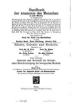 - ↑ Das »Handbuch der Anatomie und Mechanik der Gelenke« erschien in drei Bänden als Band 2 (»Bänder, Gelenke und Muskeln«), 1. Abteilung (»Gelenke«), Teile 1–3 des Handbuches der Anatomie des Menschen in acht Bänden, in Verbindung mit Prof. Dr. A. von Brunn in Rostock, Prof. Dr. J. Disse in Marburg ... Prof. Dr. Ziehen in Berlin herausgegeben von Prof. Dr. Karl von Bardeleben in 3 Unterbänden (=Teile 1–3)