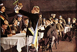 | dargestellt sind: von links: F. Kunze (B! Ghibellinia, stehend), Medizinstudent ? (B! Ghibellinia, sitzend) Franz Badel (B! Constantia), * 20.01.1872 in Skalken , Medizinstudent von WS 1893/1894 bis 22.12.1900 1 Carl Hielle (S! Barden), * 03.12.1874 in Schönlinde , Jurastudent von WS 1895/1896 bis 24.07.1900 2 Alfred Wiltschko (B! Teutonia), * um 1875 in Prag , Jurastudent von WS 1894/1895 bis 08.07.1901 3 J. Zinke (B! Albia, stehend), Ingenieursstudent H. Schmidt (L! Egerländer Landtag), Ingenieursstudent Hugo Wahrlich (B! Teutonia), * 21.03.1875 in Dehlau , Medizinstudent von WS 1894/1895 bis 15.07.1907 4 A. Herzig (B! Albia), Medizinstudent A. Gangel (B! Carolina), Chemiestudent Ernst Pommerrenig (B! Ghibellinia), * 08.03.1875 in Prag, Medizinstudent von WS 1894/1895 bis 12.06.1900 5 Rudolf Ritter Lodgman von Auen (S! Barden), * 21.12.1877 in Königgrätz , Jurastudent vom WS 1895/1896 bis 08.02.1901 6 Adolf von Schnée (B! Albia), * 22.12.1874 in Dresden , Medizinstudent vom WS 1894/1895 bis 31.05.1902 7 Ernst Walther (B! Thessalia), * 12.01.1872 in Teplitz , Medizinstudent von WS 1892/1893 bis 24.02.1900 8 T. Tschek (B! Arminia), Technikstudent Arthur Kapaun (B! Carolina), * 28.12.1875 in Wien , Jurastudent von WS 1895/1896 bis 18.03.1901 9 | Scan aus: Hermann Hubert Knoblich: Bardengeschichte 1869 - 1969 - hundert Jahre Prager Universitäts-Sängerschaft Barden zu München , Altherrenverband der Prager Universitäts-Sängerschaft Barden, München 1973, S. 41 | Oscar Rex | Datei:Landesvater in Prag von Oscar Rex um 1900-1905.jpg | |