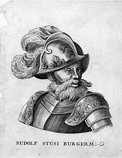 Rudolf Stüssi war für die traditionelle Geschichtsschreibung der Schweiz der Prototyp des Zürchers: arrogant, machtgierig, stolz und schlau, aber auch tapfer und heldenhaft. Das Wappen von Rudolf Stüssi bestand aus einem von Rot und Silber gespaltenen Schild mit einem Gemsgehörn in gewechselten Farben auf einem Dreiberg.