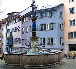| Zürich , Niederdorf : Stüssihofstatt mit dem Gedenkbrunnen und dem Wohnhaus «Königstuhl» (Stüssihofstatt 3) von Bürgermeister Rudolf Stüssi († 22. Juli 1443 in Zürich), im Hintergrund links als Zunfthaus «zur Schneidern» | Eigenes Werk | Roland zh , upload on 30. Oktober 2008 | Datei:Zürich - Niederdorf - Stüssihofstatt - zur Schnidern IMG 1375.jpg | |