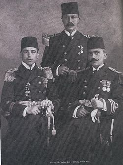| Kapitän zur See Rudolph Firle (second commander of destroyer Muavenet-ı Milliye ), Yuzbasi Ali Riza (commander of torpedo boat Sultanhisar ), and Binbashi Ahmed Saffed (Ohkay, commander of Muavenet-i Milliye ) | Axis History | NA | Datei:Firle-Ali Riza-Ahmed Saffed.jpg |